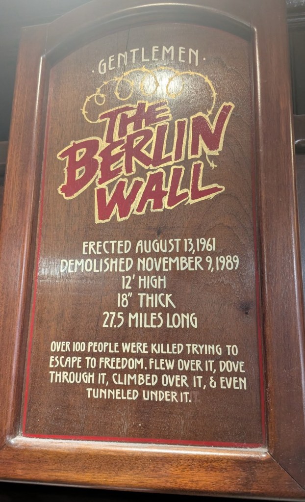We went to the Main Street Casino to see slabs of the Berlin Wall. They have them displayed behind urinals in the men’s room. Daniel took the pictures but, apparently, a security guard will clear out the restroom so women can see these bits of the Berlin Wall too.